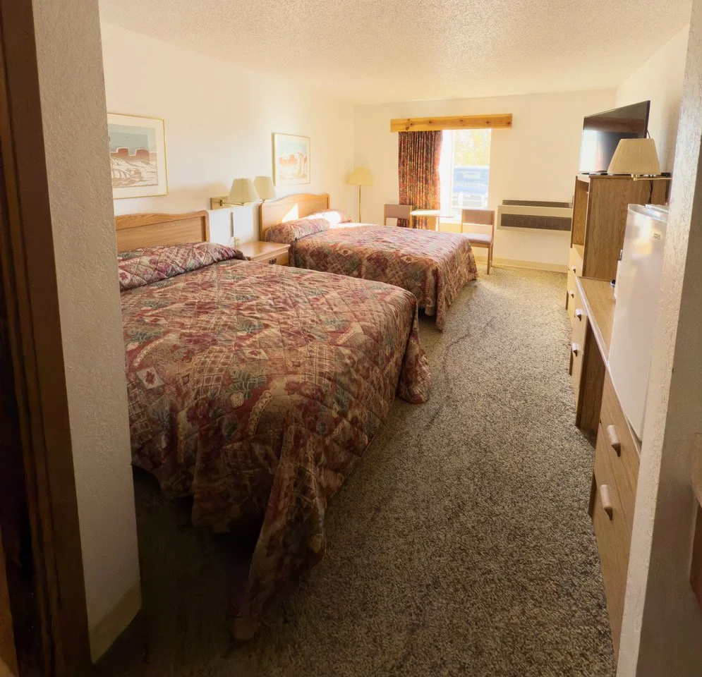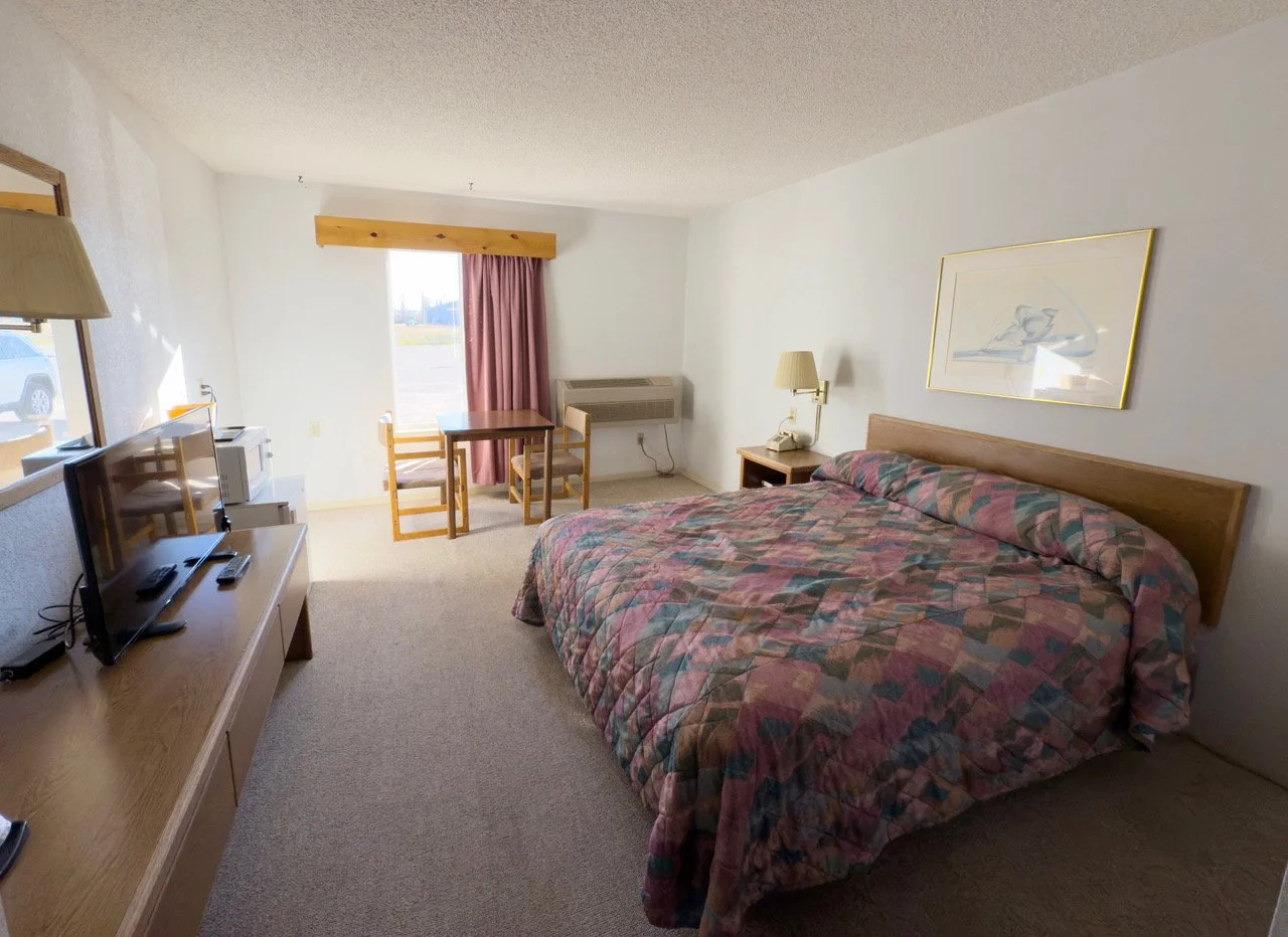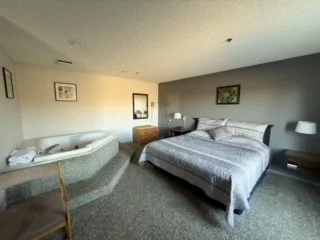 Our King Suite offers a cozy retreat featuring a spacious king-size bed and a private in-room Jacuzzi tub — ideal for unwinding after a day of exploring Aitkin. The suite includes a flat-screen TV and high-speed WiFi to keep you connected. With real keys and a no-fuss check-in, this suite provides comfort with a touch of old-school charm.
